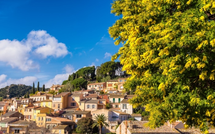 À quelques minutes du Lavandou, Bormes-les-Mimosas est un bijou provençal perché à flanc de colline. Ses maisons en pierre apparente aux volets colorés et aux balcons fleuris séduisent les promeneurs venus des quatre coins du monde. Fin février, les mimosas en fleur recouvrent les chars qui défilent pour le célèbre Corso, donnant lieu à une fête haute en couleur.